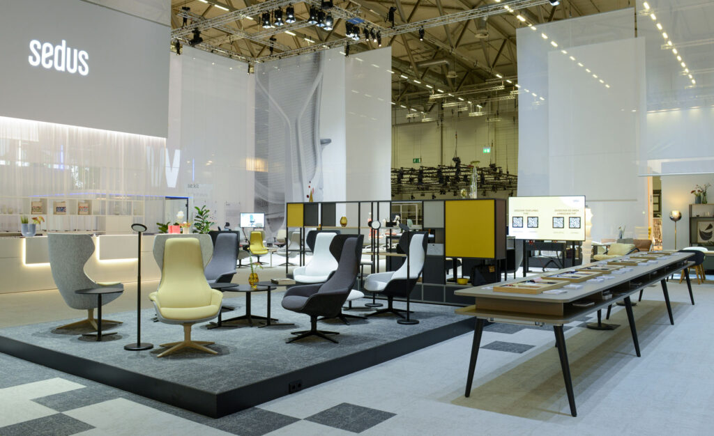 Eine große Geste inszeniert die unzähligen Exponaten des Büromöbelherstellers auf dem Messestand in Köln.